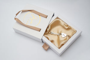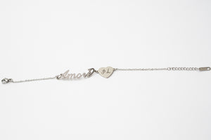 The bracelet features a refined and meaningful design: the word "Love" is delicately engraved on the surface, adding a poetic and romantic element. Next to the writing, there is a small heart, representing love and deep connection.