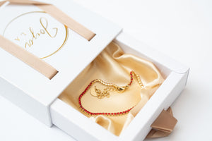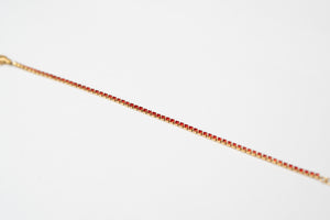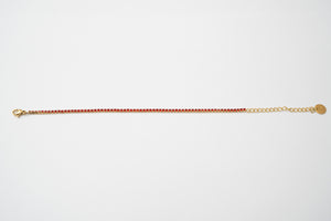 The distinctive feature of this bracelet is the red zircons set along its length. The red color of the cubic zirconia adds a vibrant and charming element to the design, creating a stunning contrast with the golden tone of the gold-plated steel. The regular arrangement of the zircons follows the classic "tennis" style, helping to create a harmonious and luminous look.