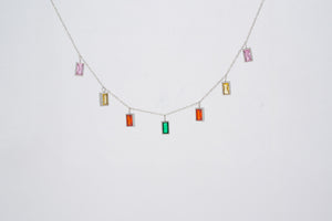 Bring a splash of vibrant color to your outfit with our stained glass charm necklace. Each charm is a small work of art, created with colored glass that captures light in a magical way, making this necklace a unique and fascinating accessory to add a touch of joy and liveliness to your look.