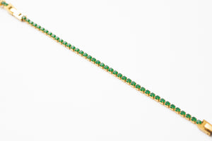 La caratteristica distintiva di questo bracciale sono gli zirconi verdi incastonati lungo la sua lunghezza. Il colore verde degli zirconi aggiunge un elemento vivace e affascinante al design, creando un contrasto straordinario con il tono dorato dell'acciaio bagnato in oro. La disposizione regolare degli zirconi segue il classico stile "tennis", contribuendo a creare un look armonioso e luminoso.
