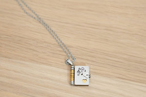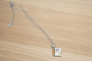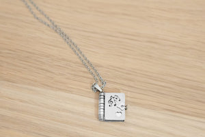 Dimensione libro collana: 1,5 cm x 2 cm. Spessore: 3 mm. Lunghezza collana: 45 cm + 5 cm di allungo.